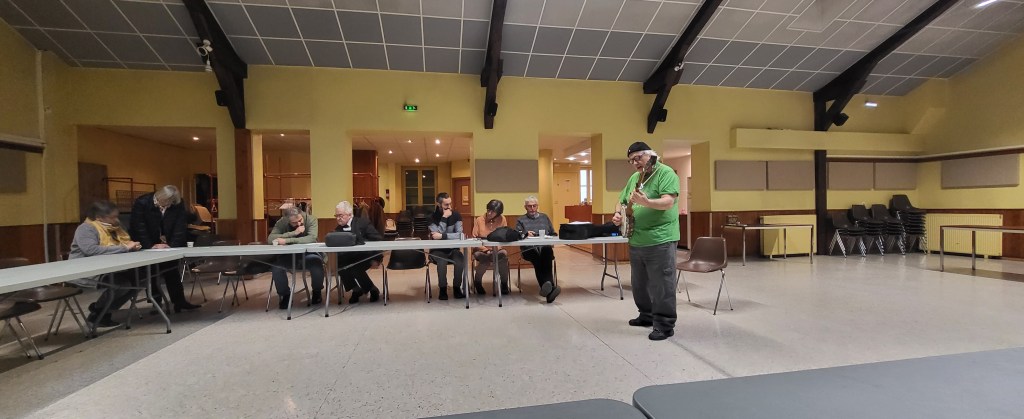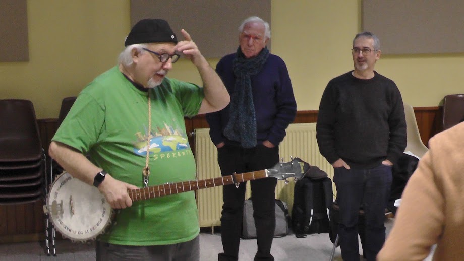 Et nous avons chanté grâce à Gérald ATHANASE du Jura et son banjo. Outre des chansons bien connues comme La Bamba du répertoire du club de Bourg-en-Bresse, il a chanté la chanson franco-occitane « Rockstars del medio d’atge » de Francis Cabrel, qu’il a traduite en espéranto.