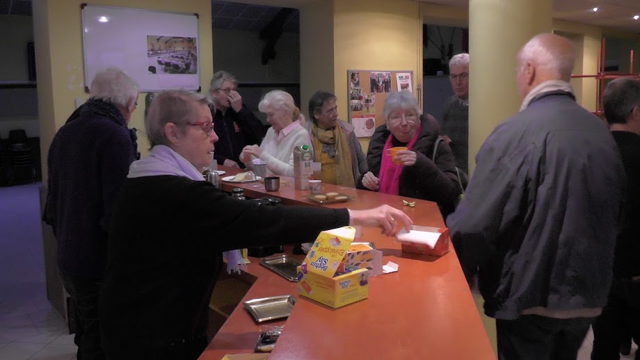Kaj fine por silentigi niajn stomakojn ni tagmanĝis kaj iomete drinkis (!) en la kutima etoso kun manĝaĵoj alportitaj de ĉiuj. Starante aŭ sidante sed ĉiam babilante !