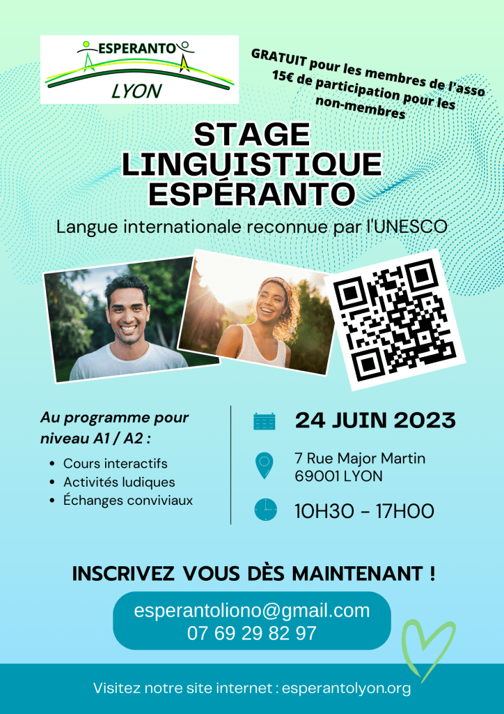 Une participation aux frais de 15€ est demandée pour cette journée de cours. Toutefois les membres de Espéranto Lyon en sont dispensés.